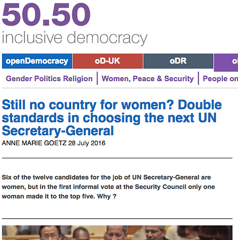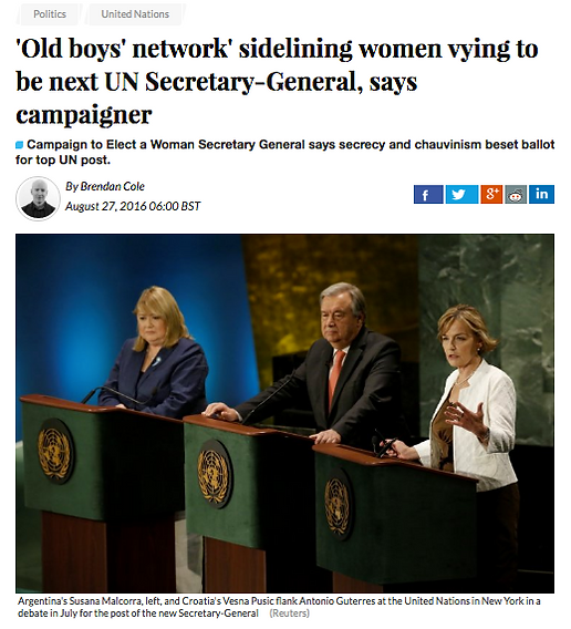 Below are links to a variety of organizations and media sources addressing the need for electing a qualified, female UN Secretary-General when current Secretary-General Ban Ki-moon steps down at the end of 2016.