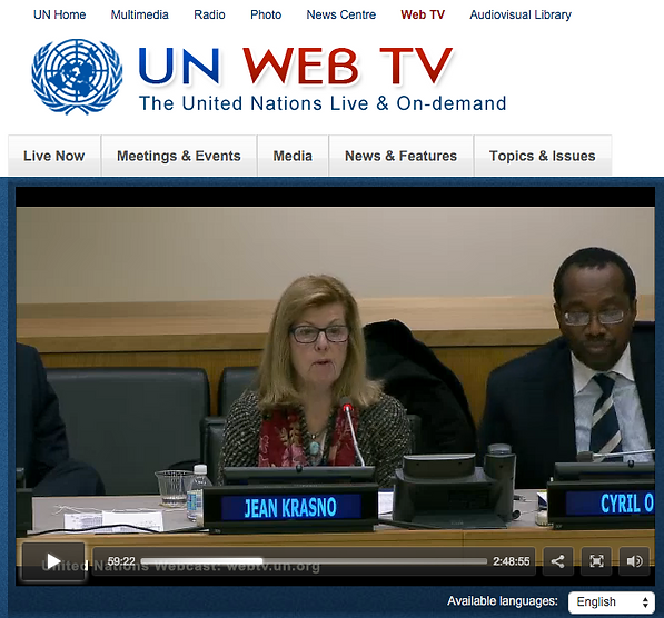 Dr. Jean Krasno, WomanSG Campaign Chair speaking at the #UNpanel titled "The United Nations Confronting War & Violence: Lessons After 70 Years."