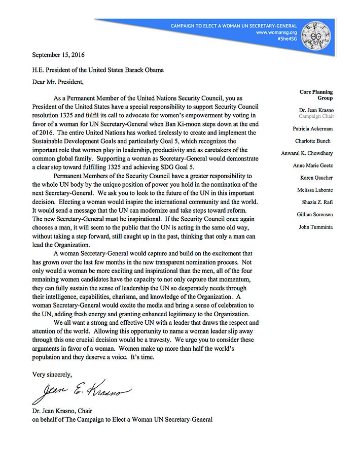 Below is the letter that the WomanSG Campaign sent to President Barack Obama on September 15, 2016. As the 71st session of the UN General Assembly began the Campaign wrote the President, the leader of a permanement member state of the Security Council with veto power, urging him to support a woman as the nest Secretary-General. The Campaign hopes that he includes this language in his address to the General Assembly. Please, feel free to use any part of the letter below to draft your own letter to the President encouraging him to do the same.
